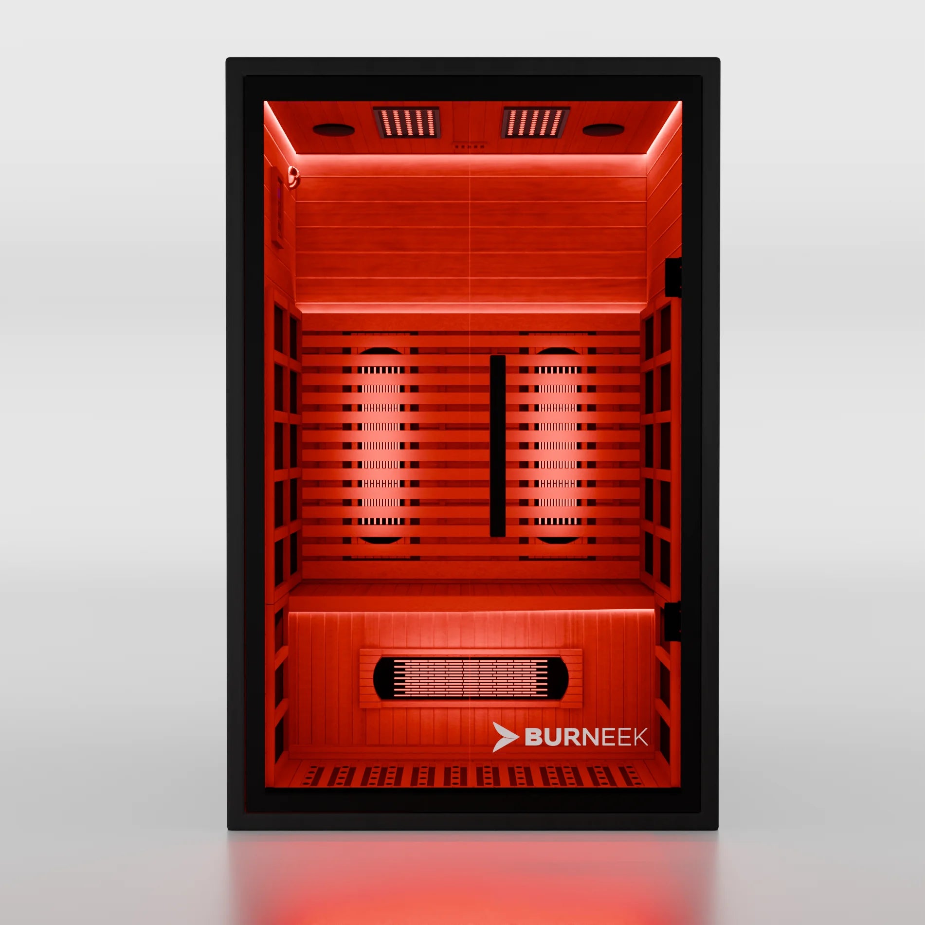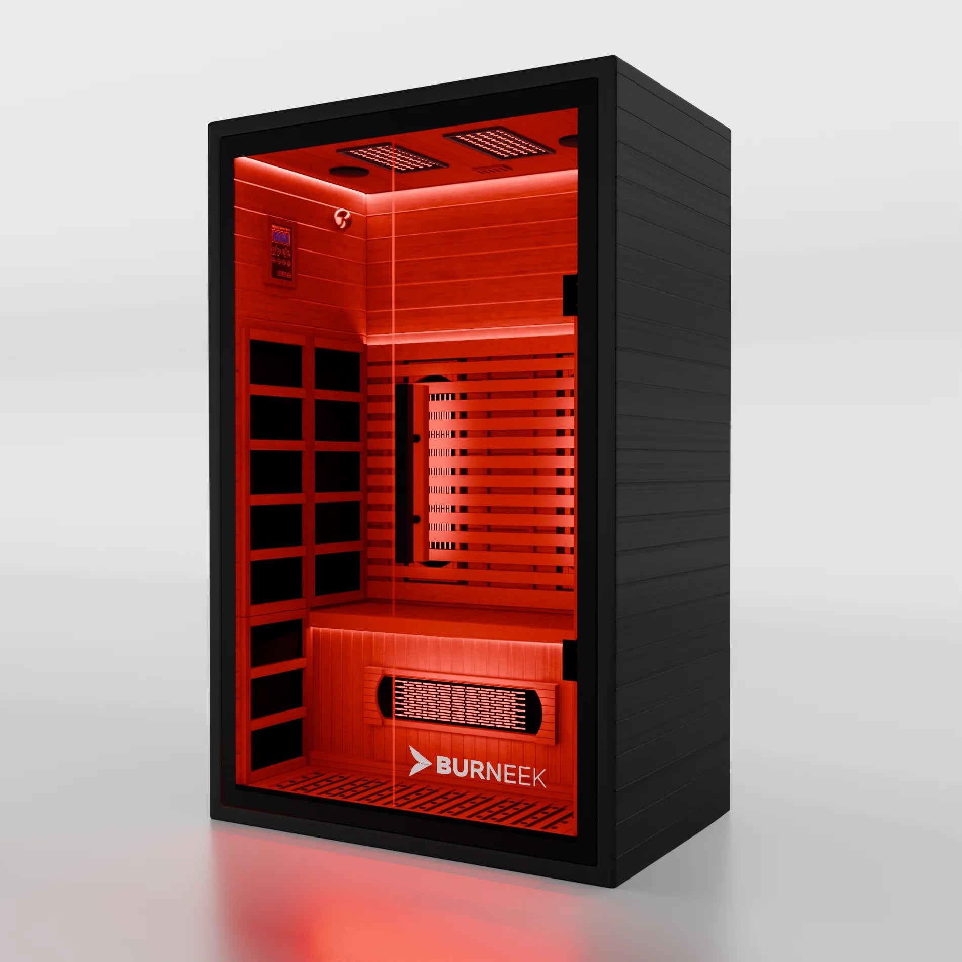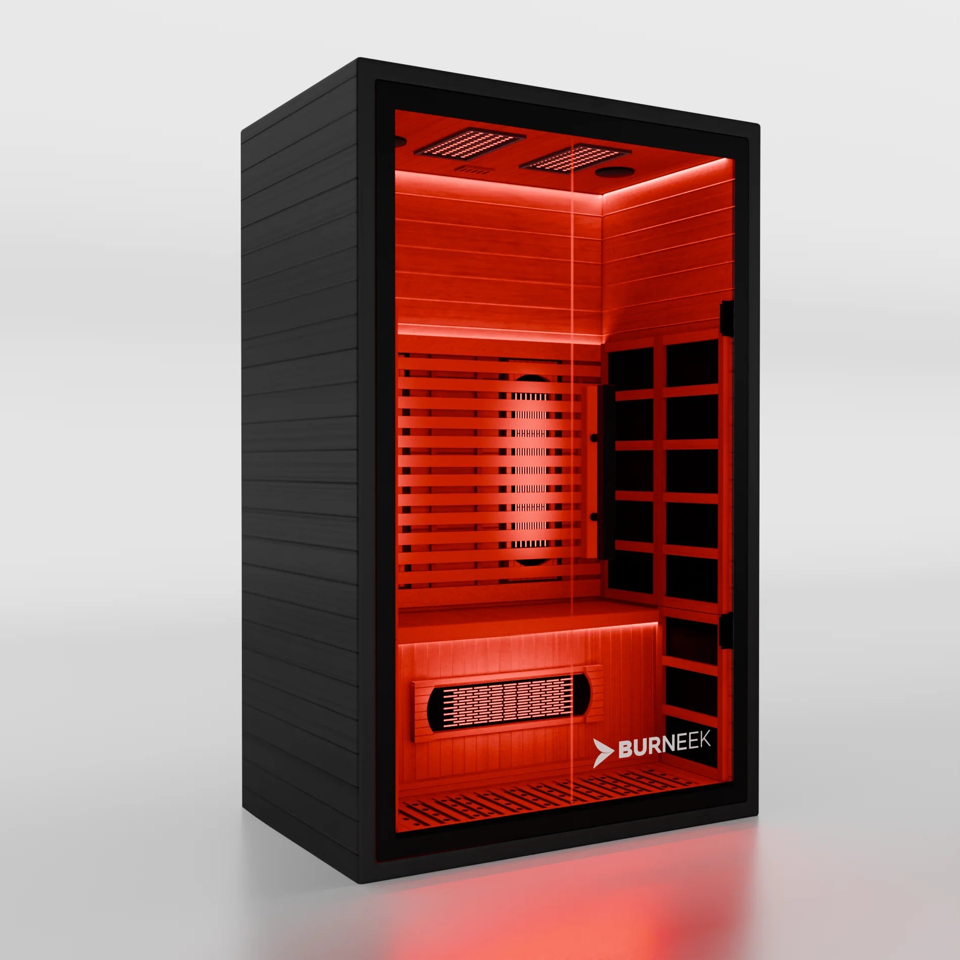 The Burneek Onyxeek is a full-spectrum infrared sauna built from 100% Canadian hemlock with an all-black finish, 8 mm tempered glass door, ultra-low EMF carbon panels and integrated 660/850 nm red light therapy.