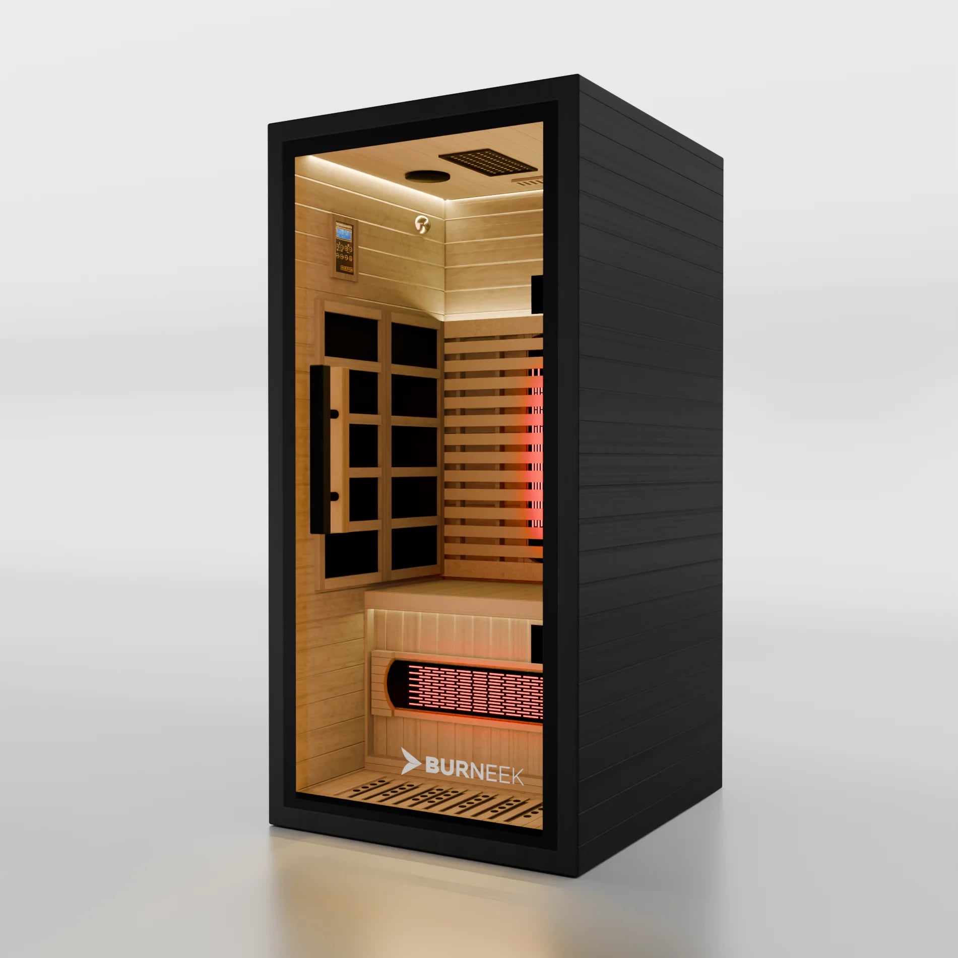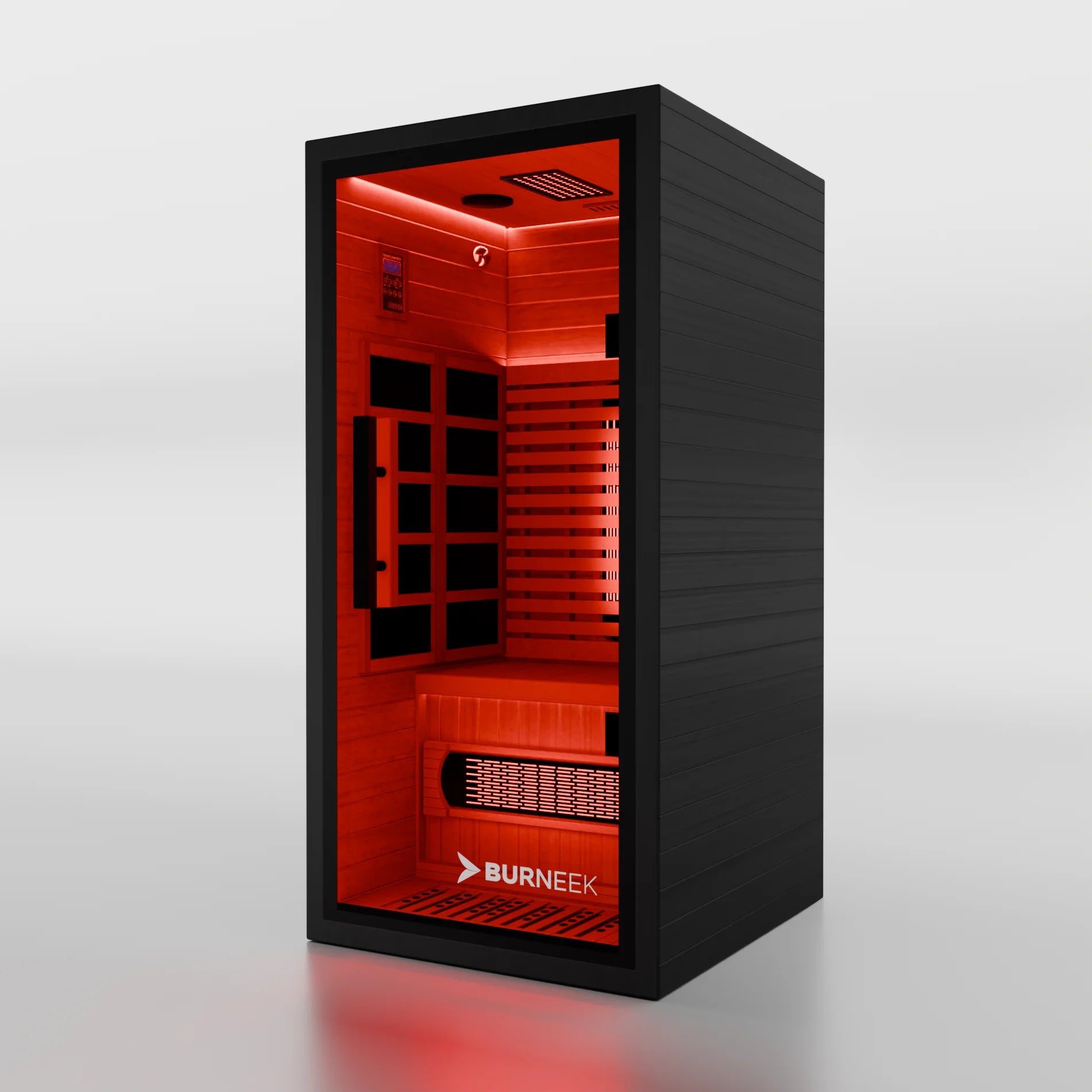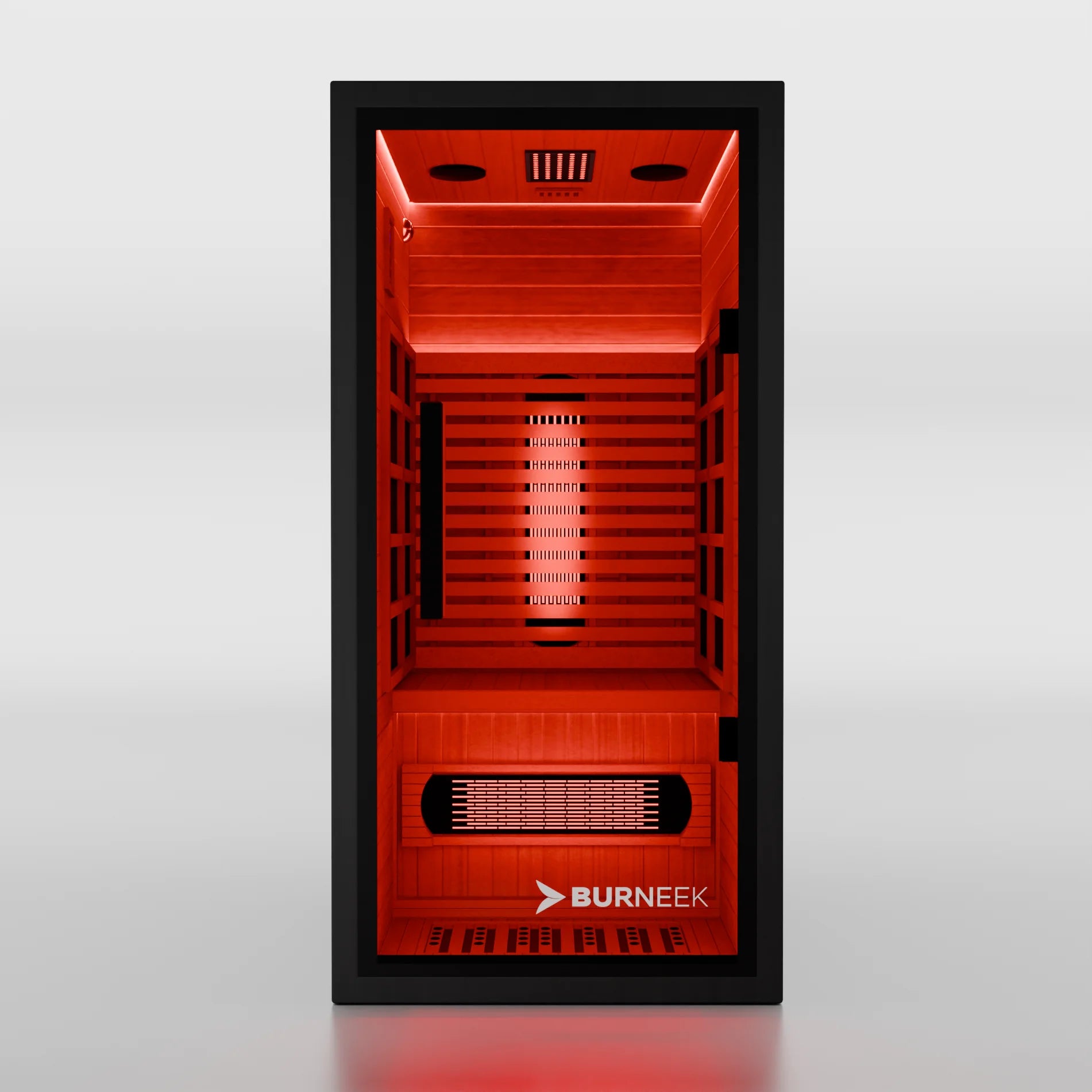 The Burneek Onyxeek is a full-spectrum infrared sauna built from 100% Canadian hemlock with an all-black finish, 8 mm tempered glass door, ultra-low EMF carbon panels and integrated 660/850 nm red light therapy.